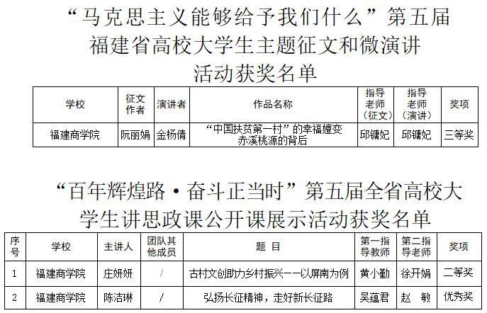 近日,《中共福建省委教育工委关于公布习近平新时代中国特色社会主义思想大学习领航计划系列主题活动获奖名单的通知》(闽委教思〔2022〕3号),beat365官网选送优秀作品参评省级公开课、微电影展示以及主题征文和微演讲活动,荣获二等奖1项,三等奖1项,优秀奖1项。