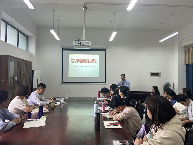 2022年5月24日下午,马克思主义基本原理教研室邀请福建省思想政治理论课教学指导委员会副主任委员、原福州大学beat365正版唯一官网院长庄穆教授做了题为“学习《德意志意识形态》经典著作,感受唯物史观逻辑与实践的力量”集体备课专题学习。教务处处长庄惠明参加了本次集体备课会,集体备课会由原理教研室主任黄玮老师主持。