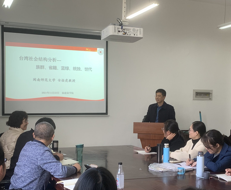11月23日,闽南师范大学闽南文化研究院台湾研究所所长、台湾问题与两岸关系研究专家安拴虎教授应邀莅临beat365官网作题为《台湾社会结构分析》学术报告,beat365正版唯一官网全体教师参加报告会。