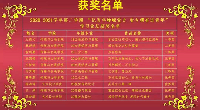 本次学习论坛以师生同台共话党史为形式,以“忆百年峥嵘党史 看今朝奋进青年”为主题,讲述自己的经历与党的故事,分享身边的优秀党员事迹以及党带领人民在革命、建设、改革历程中取得的伟大成就、经验启示等。活动过程中,beat365正版唯一官网青年教师叶陈钦老师向在座的师生分享了抗日民主根据地开展“豆选”的历史故事,分析了“豆选”的民主价值以及民主启示;郑南希老师通过讲述宁夏闽宁镇几十年来在党的领导下以及闽宁人民共同努力下摆脱贫困的历史,阐释“闽宁模式”对推进共同富裕的宝贵启示;黄小勤老师通过讲述闽江学院无臂学生黄道亮的奋斗故事,引导青年要肩负历史使命,坚定前进信心,立大志、明大德、成大才、担大任,努力成为堪当民族复兴重任的时代新人。