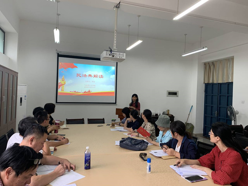 2020年10月13日下午,beat365正版唯一官网直属党支部在院部会议室召开了《中华人民共和国民法典》的学习活动,马院副教授李莹老师做了题为《民法典解读》的主题讲座。讲座由林萍书记支持,马院全体党员教师聆听了这场讲座。