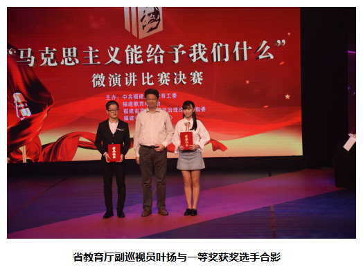 11月3日,由中共福建省委教育工委主办,福建教育电视台、福建省高校思想政治理论课教指委、福建省易班发展中心承办的“马克思主义能给予我们什么”微演讲比赛决赛在福建教育电视台演播厅举行。经过激烈的厮杀,beat365官网传媒系林荟同学(指导老师:黄玮)喜获高职组一等奖,管理工程系同学卢慧敏(指导老师:吕谋琴)捧获高职组三等奖。