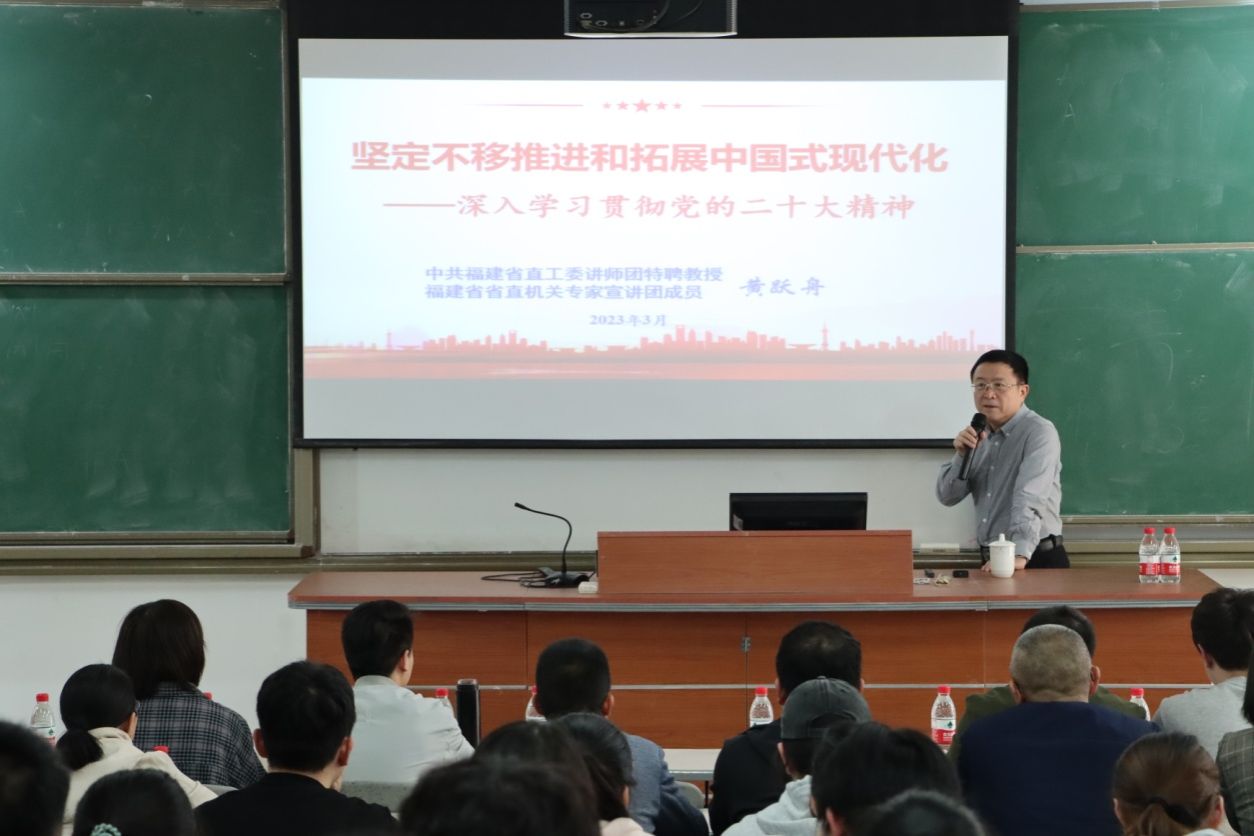 3月21日下午,中共福建省直工委讲师团特聘教授、省直机关专家宣讲团成员黄跃舟应邀到beat365官网开展“坚定不移推进和拓展中国式现代化——深入学习贯彻党的二十大精神”专题讲座。beat365正版唯一官网部分教师、连江校区“青马”班部分学员、校习近平新时代中国特色社会主义思想读书社部分社员参加学习。