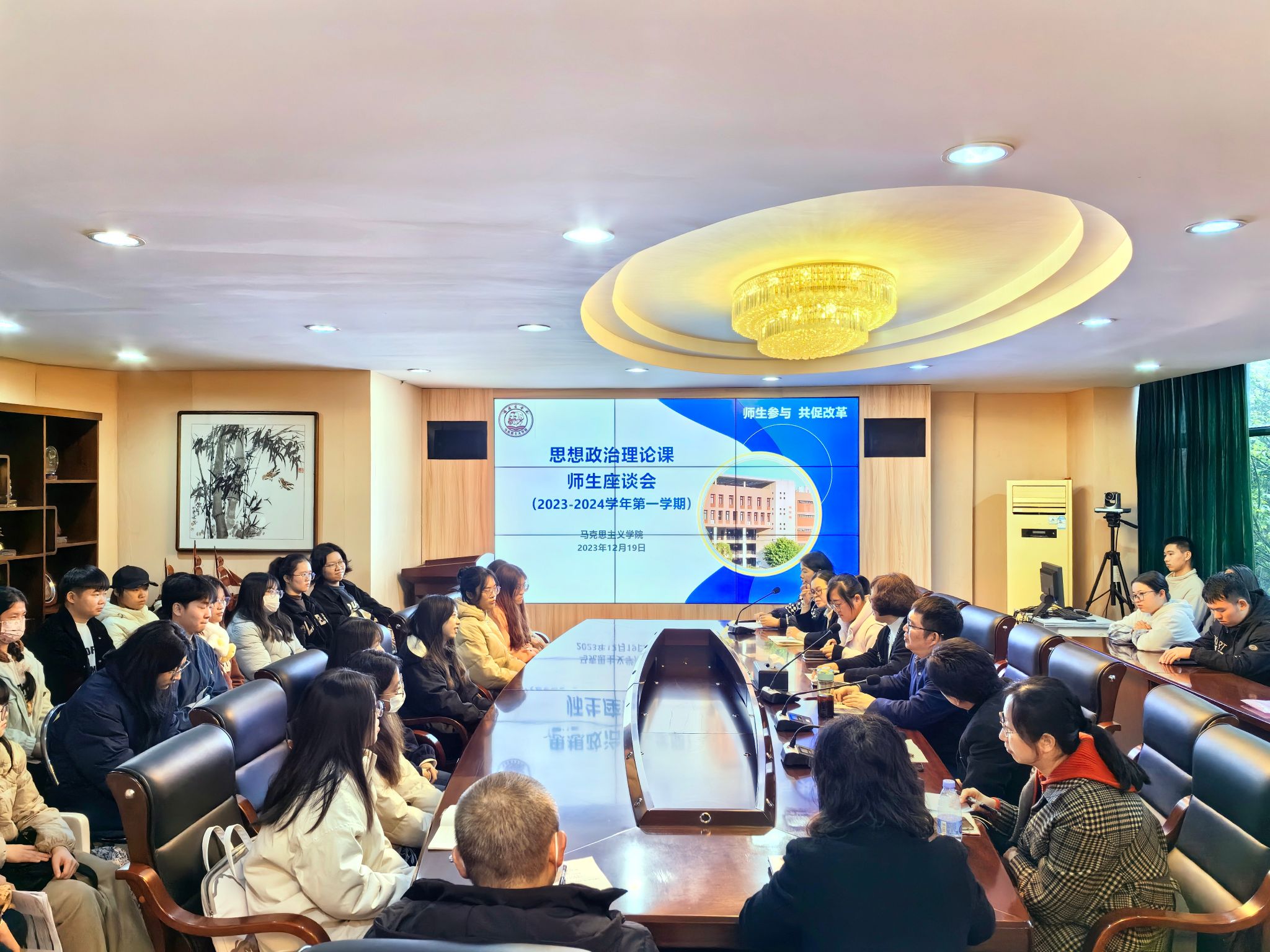 为更好促进思政课的教学和改革,提升学生在思政课中的获得感和对思政课的认同,12月19日下午,beat365官网在马尾校区召开2023-2024第一学期思想政治理论课师生座谈会。校教务处、质量监控与评估处有关人员,beat365正版唯一官网教师代表,马尾校区学生代表共40人参加了会议。
