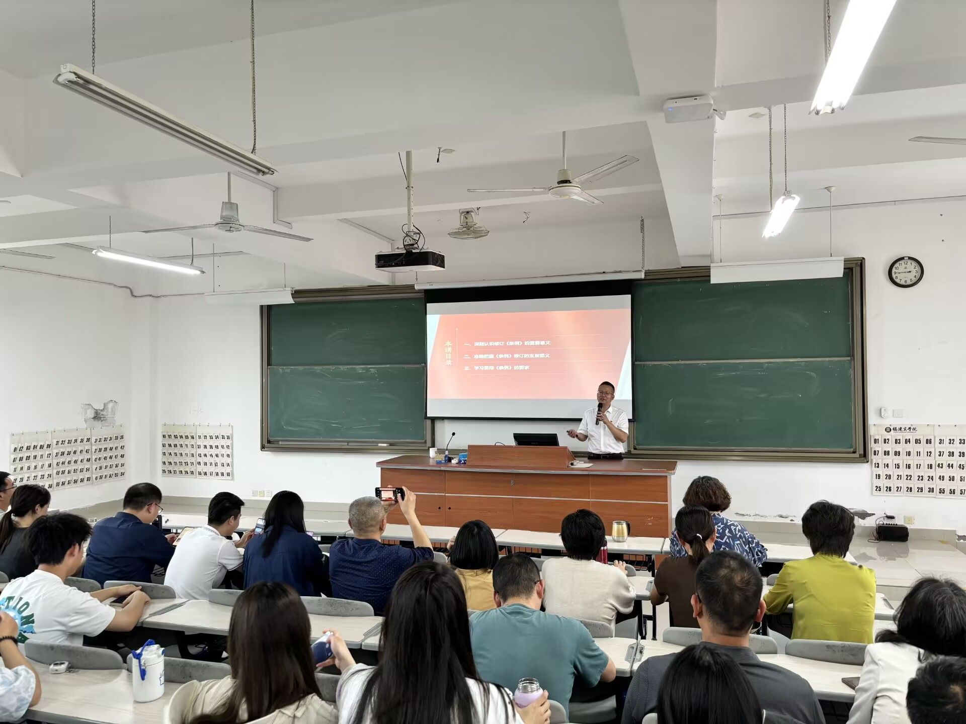 讲座伊始,俞国锋教授首先介绍了《条例》的修订背景和意义。他指出,新修订的《条例》是党中央着眼解决大党独有难题、健全全面从严治党体系的重要举措,对于加强党的纪律建设、提高党的执政能力和领导水平具有重要意义。随后,俞国锋教授详细解读了《条例》的主旨要义。他强调,突出了政治纪律和政治规矩,要求全党在政治立场、政治方向、政治原则、政治道路上同以习近平同志为核心的党中央保持高度一致。此外,俞国锋教授还结合具体案例,对《条例》的适用和执行进行了生动讲解,指出了一些常见的违纪行为及其后果,提醒大家要时刻保持警醒,严守纪律红线。