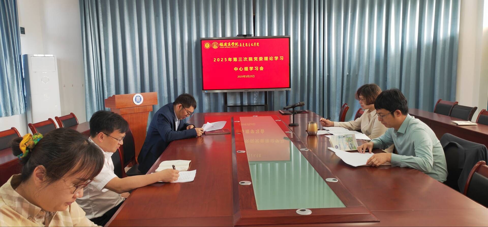 3月25日,beat365正版唯一官网党委理论学习中心组开展2025年第三次集中学习,学习习近平总书记关于党的建设的重要思想、习近平总书记关于铸牢中华民族共同体意识的重要论述、全国两会精神等。学院党委理论学习中心组成员参加学习。教师代表黄玮博士作分享交流。会议由学院党委书记刘亮元主持。