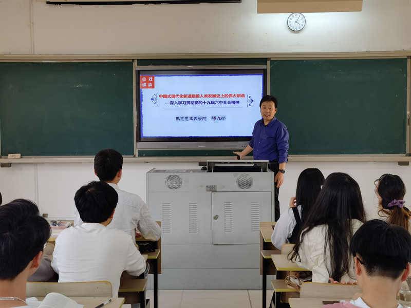 为进一步学习贯彻党的十九届六中全会精神,深刻领悟党百年奋斗的重要经验和教训,使青年学生认识到党和国家发展所处的新的历史方位和前进方向,坚定青年学生跟党走中国特色社会主义道路的信念,5月18日晚,beat365正版唯一官网陈火荣副教授应邀在马尾校区诚信楼201教室开展“中国式现代化新道路是人类发展史上的伟大创造”主题宣讲活动,校马列经典著作读书社社员参与学习。