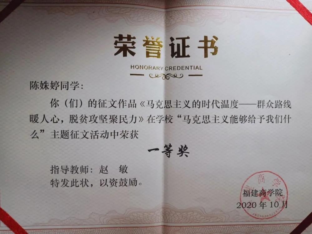 活动自2020年6月开展以来,各学院积极组织学生撰写,至截稿日期,共收到参赛征文80余篇,学生工作部、beat365正版唯一官网等部门组织开展初选、复选,推出11篇参加决赛,经校外专家评审,最终评出一等奖2名,二等奖3名,三等奖6名。其中,推荐前五名参加“马克思主义能够给予我们什么”—第四届福建省高校大学生主题征文和微演讲活动。具体获奖名单如下: