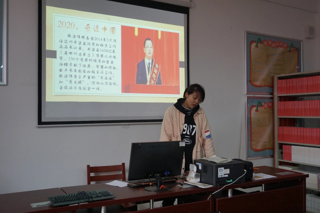 庄妍妍同学作了题为《齐学“四史”,决胜脱贫》的宣讲,她以总书记2020年1月8日在“不忘初心、牢记使命”主题教育总结大会上的讲话导入宣讲,阐述了“四史”的具体涵义以及学习“四史”的意义。她认为新时代的中国青年要肩负时代重任,学好知识,打好基础,努力为全面建设社会主义现代化国家燃烧自己的力量和智慧,把青春和梦想献给家乡。